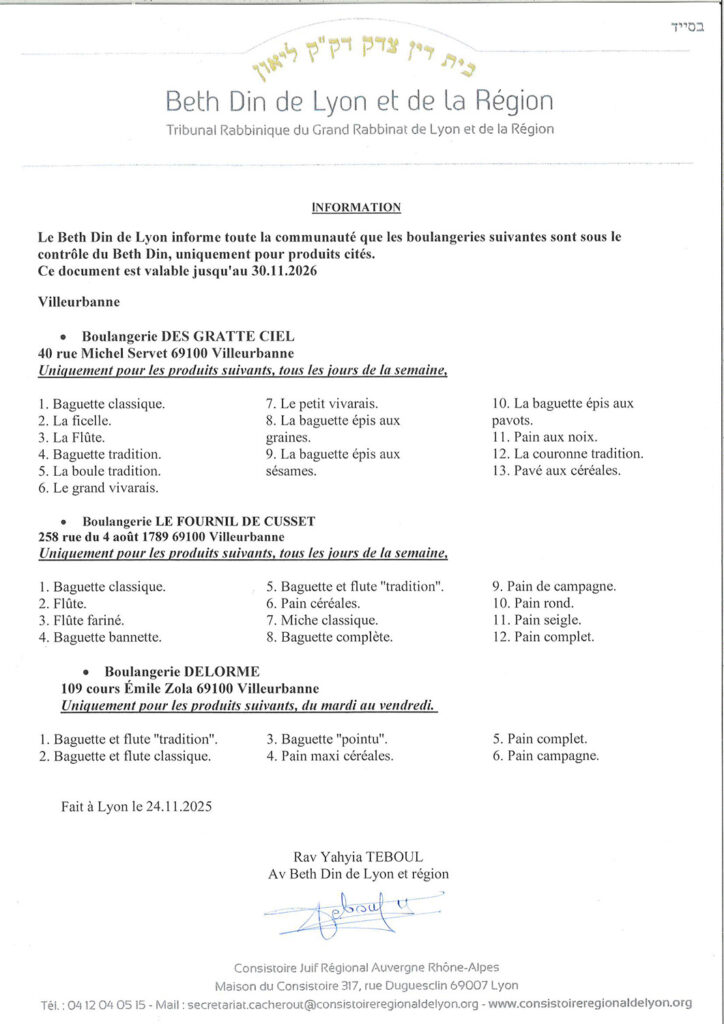 Le Beth Din de Lyon informe la communauté juive que la Boulangerie des Gratte-Ciel située au 40 rue Michel Servet sera ouverte exceptionnellement le jeudi 13 Avril après la fête de Pessah jusqu’à 23H afin de vous permettre d’acheter les pains autorisés ainsi que de la farine et de la levure.